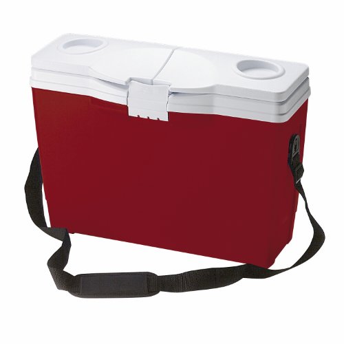 The Rubbermaid FG180104MODRD 14 Can Briefcase Cooler - Red has a unique design and shape that maximizes space by fitting into tight, slim places yet holding 14 cans or a 1.5 liter bottle upright. Perfect for car trips or toting to football games. Its superior thermal retention keeps content cold. A padded shoulder strap makes it easy to carry and a split-lid with convenient cup holders provides easy access to food and beverage.